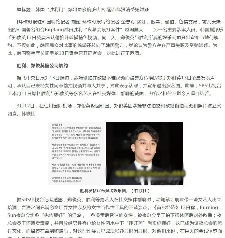 这可算是一个老生常谈的故事,发生在2019年。当时,韩国流行乐团BigBang如日中天,正在疯狂吸引关注和金钱,成为韩国娱乐圈的顶尖男团,甚至在亚太、欧美地区也产生了深远的影响。就在此时,该团体却因一起性丑闻而曝光了众多成员的不光彩形象,核心成员胜利更是因此选择退出娱乐圈。
